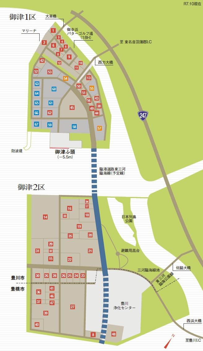 御津地区は三河港の中央部に位置し、東名高速道路豊川IC・音羽蒲郡ICへの交通アクセスも良く、生産・物流拠点として重要な役割を担っています。近隣では、令和7年3月に国道23号名豊道路が全線開通しました。